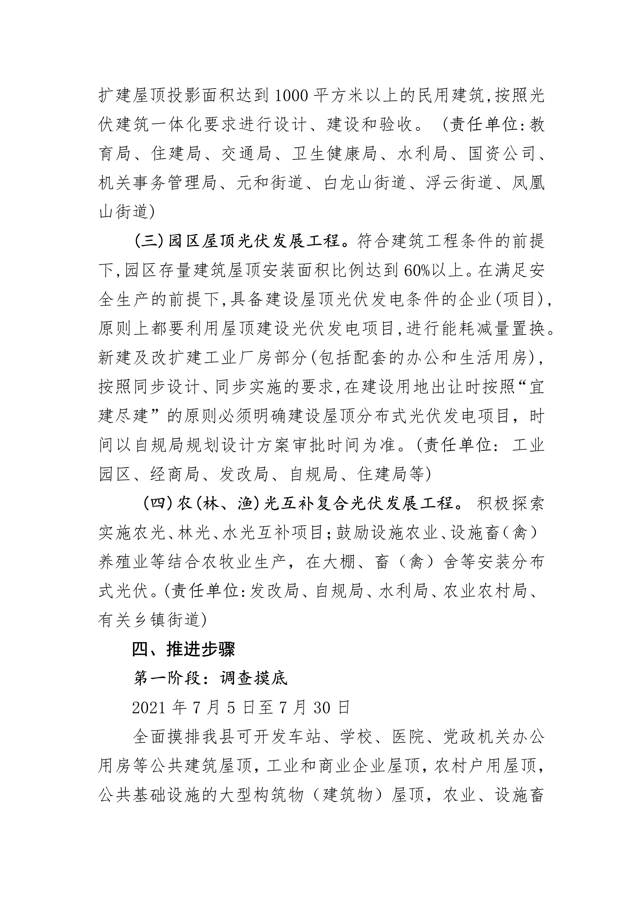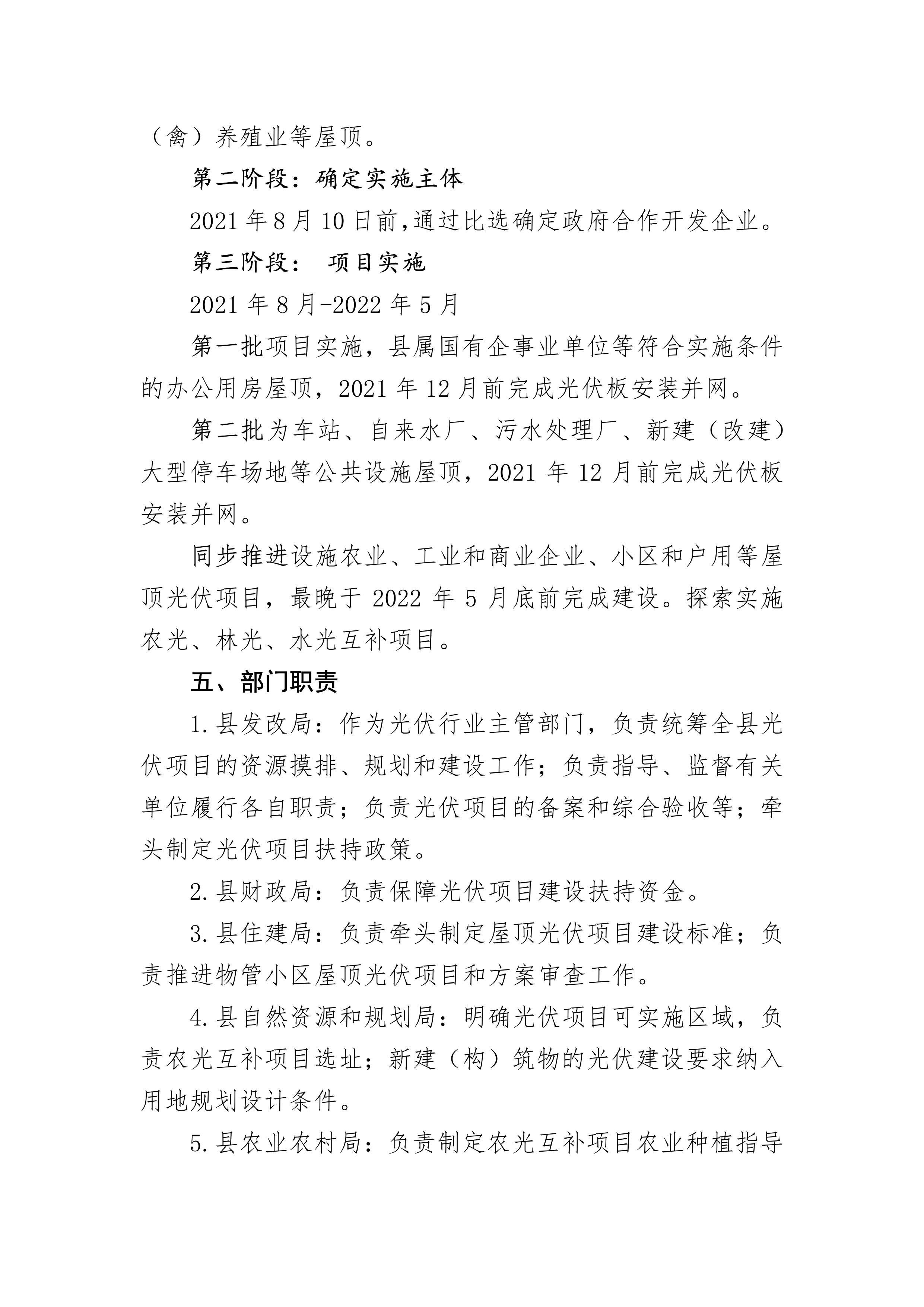第一批項目實施,縣屬國有企事業單位等符合實施條件的辦公用房屋頂,2021年12月前完成光伏板安裝并網。